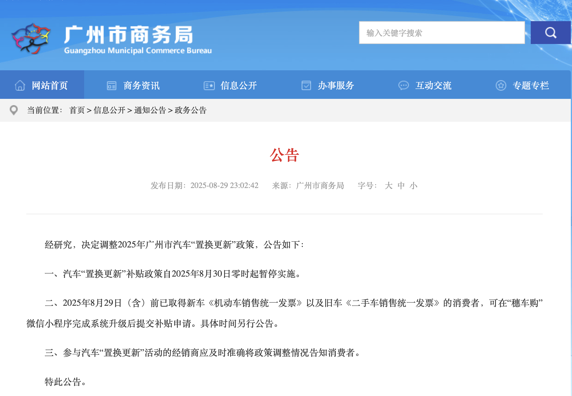 8月29日晚和业众,广州市商务局发布公告,明确汽车“置换更新”补贴政策自2025年8月30日零时起暂停实施。